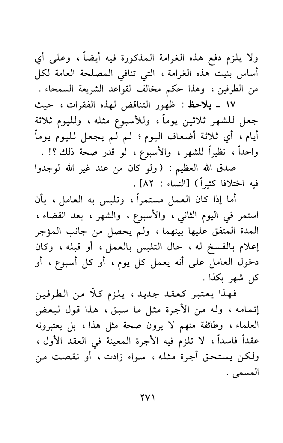17- يلاحظ ظهور التناقض لهذه الفقرات، حيث جعل للشهر ثلاثين يوما، وللأسبوع مثله، ولليوم ثلاثة أيام، أي ثلاثة أضعاف اليوم؟ لم لم يجعل لليوم يوما واحدا، نظيرا للشهر، والأسبوع، لو قدر صحة ذلك؟ !. صدق الله العظيم: {وَلَوْ كَانَ مِنْ عِنْدِ غَيْرِ اللَّهِ لَوَجَدُوا فِيهِ اخْتِلافاً كَثِيراً} [سورة النساء آية: 82] . أما إذا كان العمل مستمرا، وتلبس به العامل، بأن استمر في اليوم الثاني، والأسبوع، والشهر، بعد انقضاء المدة المتفق عليها بينهما، ولم يحصل من جانب المؤجر إعلام بالفسخ له، حال التلبس بالعمل أو قبله، وكان دخول العامل على أنه يعمل كل يوم، أو كل أسبوع، أو كل شهر بكذا. فهذا يعتبر كعقد جديد، يلزم كلا من الطرفين إتمامه، وله من الأجرة مثل ما سبق؛ هذا قول لبعض العلماء، وطائفة منهم لا يرون صحة مثل هذا، بل يعتبرونه عقدا فاسدا، لا تلزم فيه الأخرة المعينة في العقد الأول، ولكن يستحق أجرة مثله، سواء زادت أو نقصت من المسمى.