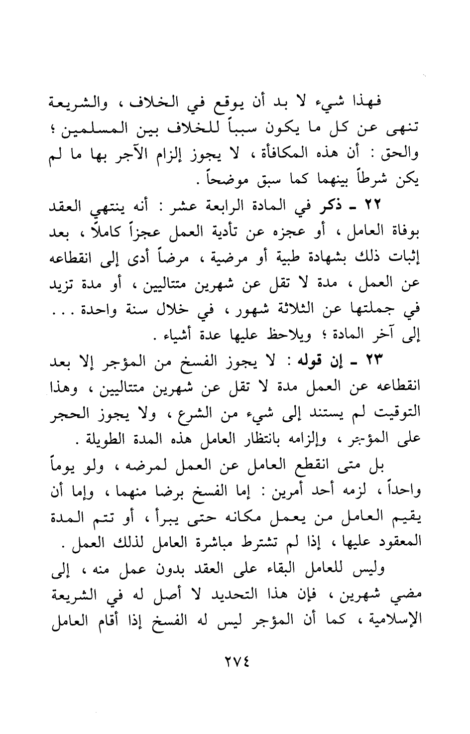 23- إن قوله: لا يجوز الفسخ من المؤجر إلا بعد انقطاعه عن العمل مدة لا تقل عن شهرين متتاليين، وهذا التوقيت لم يستند إلى شيء من الشرع، ولا يجوز الحجر على المؤجر، وإلزامه بانتظار العامل هذه المدة الطويلة. بل متى انقطع العامل عن العمل لمرضه، ولو يوما واحدا، لزمه أحد أمرين: إما الفسخ برضى منهما، وإما أن يقيم العامل من يعمل مكانه حتى يبرأ، أو تتم المدة المعقود عليها، إذا لم تشترط مباشرة العامل لذلك العمل. وليس للعامل البقاء على العقد بدون عمل منه، إلى مضي شهرين، فإن هذا التحديد لا أصل له في الشريعة الإسلامية، كما أن المؤجر ليس له الفسخ إذا أقام العامل