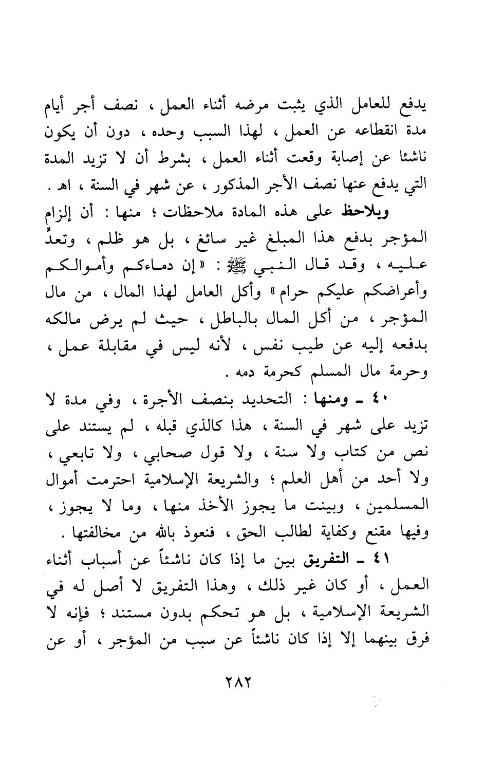 41- التفريق بين ما إذا كان ناشئا عن أسباب أثناء العمل، أو كان غير ذلك، وهذا التفريق لا أصل له في الشريعة الإسلامية؛ بل هو تحكم بدون مستند، فإنه لا فرق بينهما إلا إذا كان ناشئا عن سبب من المؤجر، أو عن