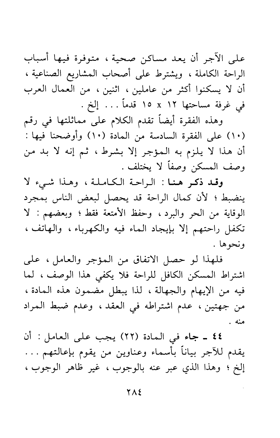على الآجر أن يعد مساكن صحية متوفر فيها أسباب الراحة الكاملة، ويشترط على أصحاب المشاريع الصناعية أن لا يسكنوا أكثر من عاملين اثنين من العمال العرب في غرفة مساحتها 12 × 15 قدما ... إلخ. وهذه الفقرة أيضا تقدم الكلام على مماثلتها في رقم (10) على الفقرة السادسة من المادة (10) وأوضحنا فيها أن هذا لا يلزم به المؤجر إلا بشرط؛ ثم إنه لا بد من وصف المسكن وصفا لا يختلف. وقد ذكر هنا: الراحة الكاملة، وهذا شيء لا ينضبط، لأن كمال الراحة قد يحصل لبعض الناس بمجرد الوقاية من الحر والبرد، وحفظ الأمتعة فقط، وبعضهم لا تكفل راحتهم إلا بإيجاد الماء فيه والكهرباء، والهاتف، ونحوها. فلهذا لو حصل الاتفاق من المؤجر والعامل على اشتراط المسكن الكافل للراحة فلا يكفي هذا الوصف، لما فيه من الإيهام والجهالة، لذا يبطل مضمون هذه المادة من جهتين: عدم اشتراطه في العقد، وعدم ضبط المراد منه.