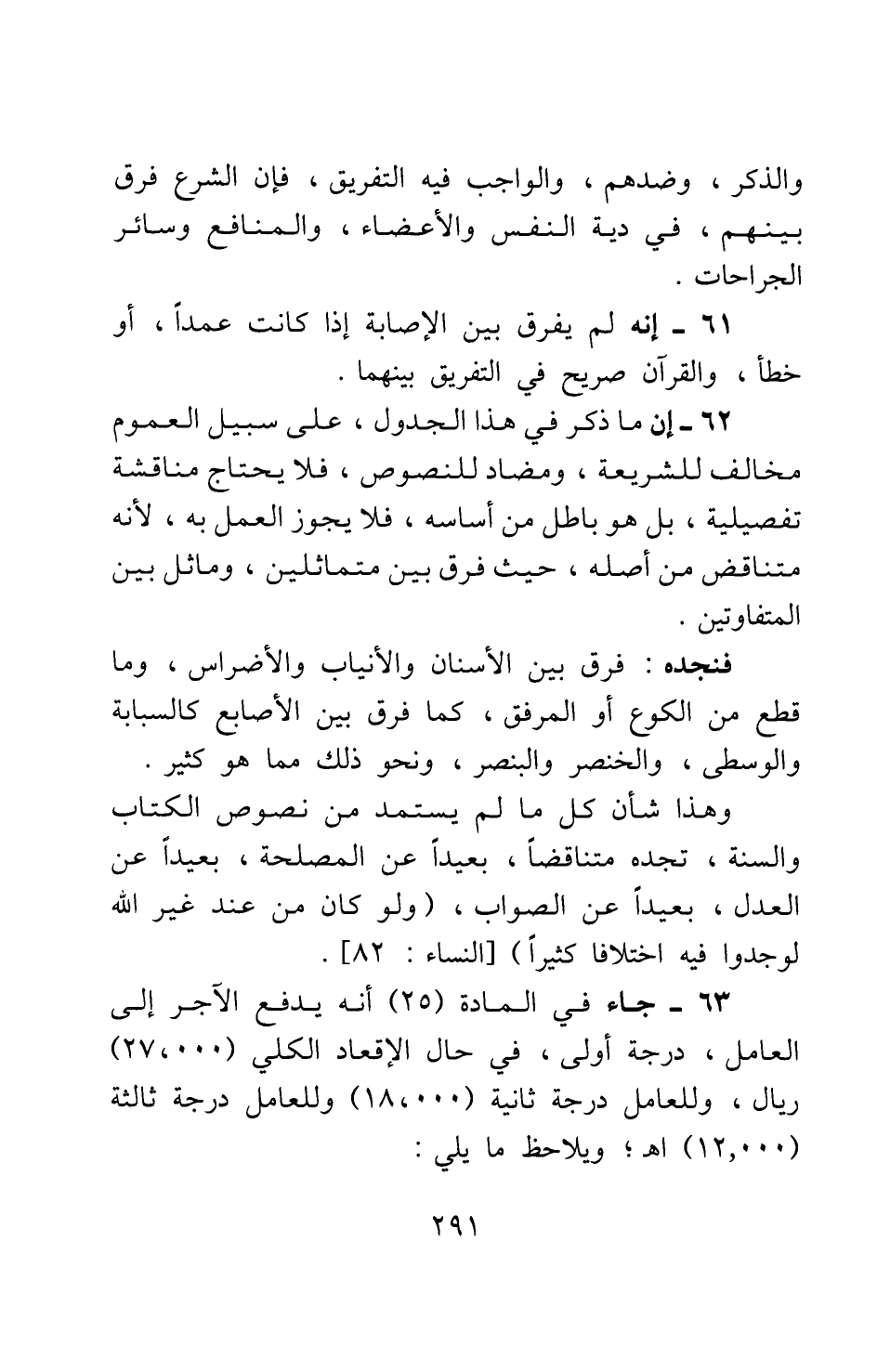 62- إن ما ذكر في هذا الجدول، على سبيل العموم مخالف للشريعة، ومضاد للنصوص؛ فلا يحتاج مناقشة تفصيلية، بل هو باطل من أساسه؛ فلا يجوز العمل به، لأنه متناقض من أصله، حيث فرق بين متماثلين، وماثل بين المتفاوتين. فنجده فرق بين الأسنان والأنياب والأضراس، وما قطع من الكوع أو المرفق، كما فرق بين الأصابع كالسبابة والوسطى، والخنصر والبنصر، ونحو ذلك مما هو كثير. وهذا شأن كل ما لم يستمد من نصوص الكتاب والسنة، تجده متناقضا، بعيدا عن المصلحة، بعيدا عن العدل، بعيدا عن الصواب، {وَلَوْ كَانَ مِنْ عِنْدِ غَيْرِ اللَّهِ لَوَجَدُوا فِيهِ اخْتِلافاً كَثِيراً} [سورة النساء آية: 82] .