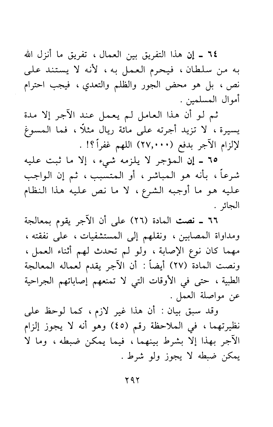 66- نصت المادة (26) على أن الآجر يقوم بمعالجة ومداواة المصابين، ونقلهم إلى المستشفيات، على نفقته مهما كان نوع الإصابة، ولو لم تحدث لهم أثناء العمل. ونصت المادة (27) أيضا: أن الأجر يقدم لعماله المعالجة الطبية، حتى في الأوقات التي لا تمنعهم إصاباتهم الجراحية عن مواصلة العمل. وقد سبق بيان أن هذا غير لازم، كما لوحظ على نظيرتهما، في الملاحظة رقم (45) ، وهو أنه لا يجوز إلزام الآجر بهذا إلا بشرط بينهما، فيما يمكن ضبطه؛ وما لا يمكن ضبطه لا يجوز ولو شرط.