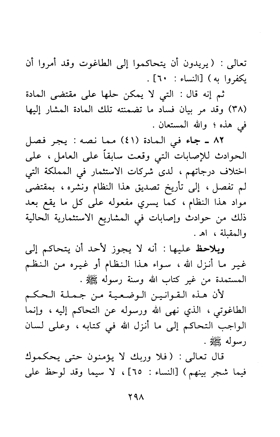 82- جاء في المادة (41) مما نصه: يجري فصل الحوادث للإصابات التي وقعت سابقا على العامل على اختلاف درجاتهم، لدى شركات الاستثمار في المملكة، التي لم تفصل إلى تأريخ تصديق هذا النظام ونشره، بمقتضى مواد هذا النظام؛ كما يسري مفعوله على كل ما يقع بعد ذلك من حوادث وإصابات في المشاريع الاستثمارية الحالية والمقبلة، ا?. ويلاحظ عليها: أنه لا يجوز لأحد أن يتحاكم إلى غير ما أنزل الله، سواء هذا النظام أو غيره من النظم المستمدة من غير كتاب الله وسنة رسوله صلى الله عليه وسلم؛ لأن هذه القوانين الوضعية من جملة الحكم الطاغوتي، الذي نهى الله ورسوله عن التحاكم إليه؛ وإنما الواجب التحاكم إلى ما أنزل الله في كتابه، وعلى لسان رسوله صلى الله عليه وسلم. قال تعالى: {فَلا وَرَبِّكَ لا يُؤْمِنُونَ حَتَّى يُحَكِّمُوكَ فِيمَا شَجَرَ بَيْنَهُمْ} [سورة النساء آية: 65] ، لا سيما وقد لوحظ على