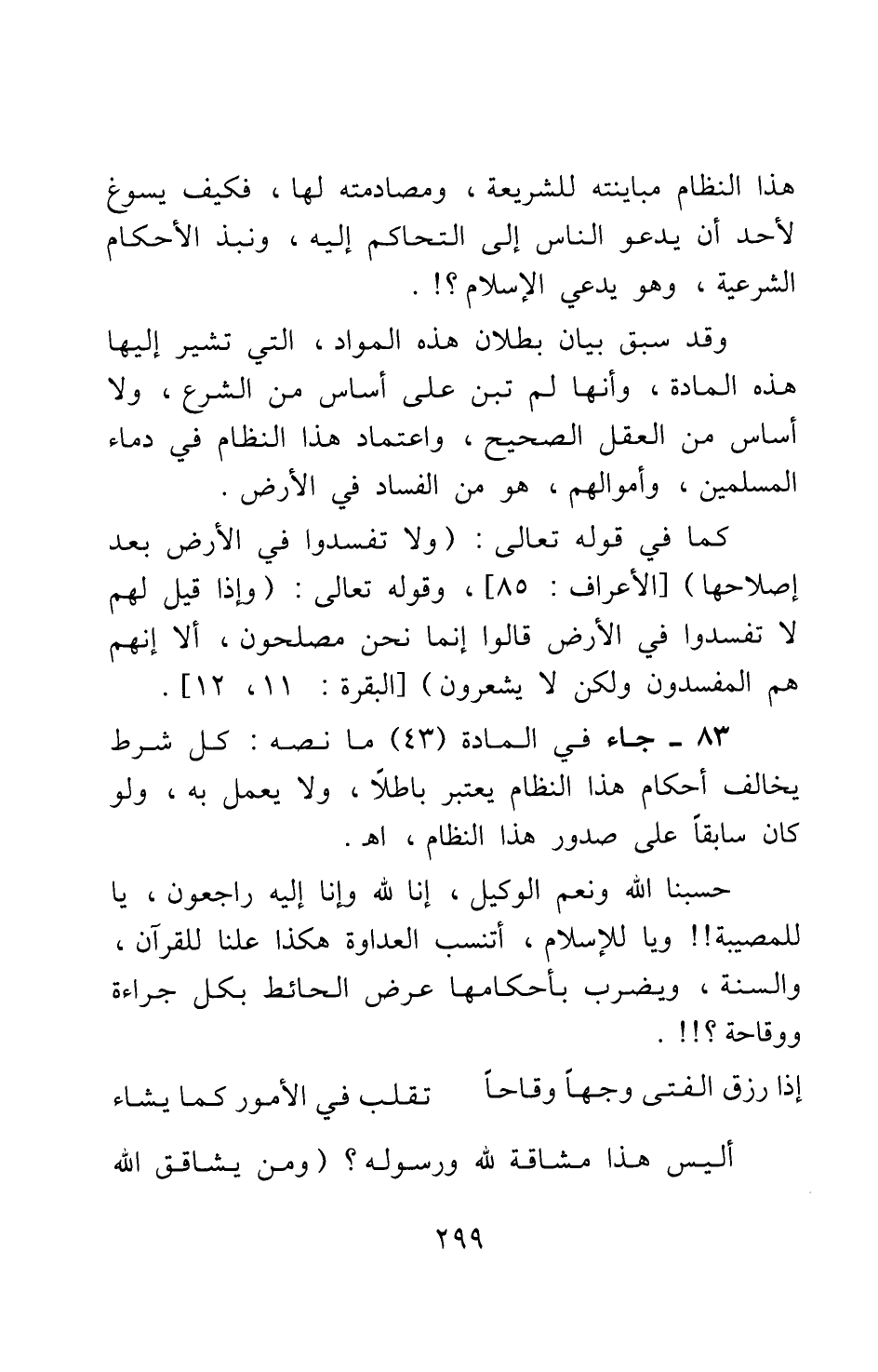 83- جاء في المادة (43) ما نصه: كل شرط يخالف أحكام هذا النظام يعتبر باطلا ولا يعمل به، ولو كان سابقا على صدور هذا النظام. ا?. حسبنا الله ونعم الوكيل، إنا لله وإنا إليه راجعون، يا للمصيبة!! ويا للإسلام! أتنسب العداوة هكذا علنا للقرآن، والسنة، ويضرب بأحكامها عرض الحائط بكل جراءة ووقاحة؟ !!