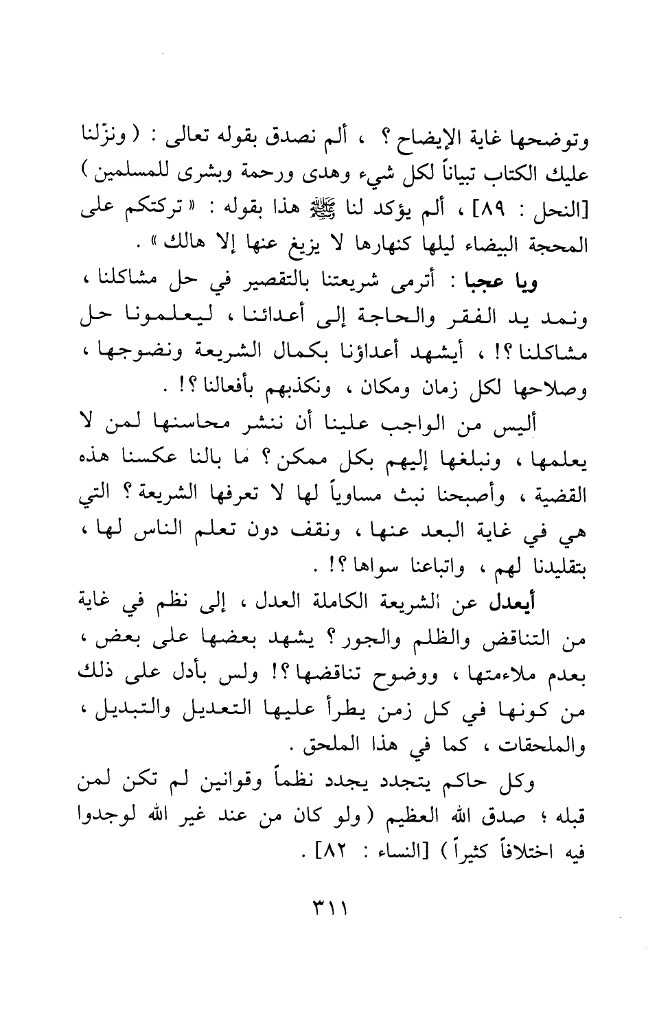 ويا عجبا! أترمى شريعتنا بالتقصير في حل مشاكلنا، ونمد يد الفقر والحاجة إلى أعدائنا، ليعلمونا حل مشاكلنا؟! أيشهد أعداؤنا بكمال الشريعة ونضوجها، وصلاحها لكل زمان ومكان، ونكذبهم بأفعالنا؟! أليس من الواجب علينا أن ننشر محاسنها لمن لا يعلمها، ونبلغها إليهم بكل ممكن؟ ما بالنا عكسنا هذه القضية، وأصبحنا نبث مساويا لها لا تعرفها الشريعة التي هي في غاية البعد عنها، ونقف دون تعلم الناس لها، بتقليدنا لهم، واتباعنا سواها؟ !. أيعدل عن الشريعة الكاملة العدل، إلى نظم في غاية من التناقض والظلم والجور، يشهد بعضها على بعض بعدم ملاءمتها، ووضوح تناقضها؟ ! وليس بأدل على ذلك من كونها في كل زمن يطرأ عليها التعديل والتبديل، والملحقات، كما في هذا الملحق. وكل حاكم يتجدد يجدد نظما وقوانين لم تكن لمن قبله; صدق الله العظيم {وَلَوْ كَانَ مِنْ عِنْدِ غَيْرِ اللَّهِ لَوَجَدُوا فِيهِ اخْتِلافاً كَثِيرا} [سورة النساء آية: 82] .