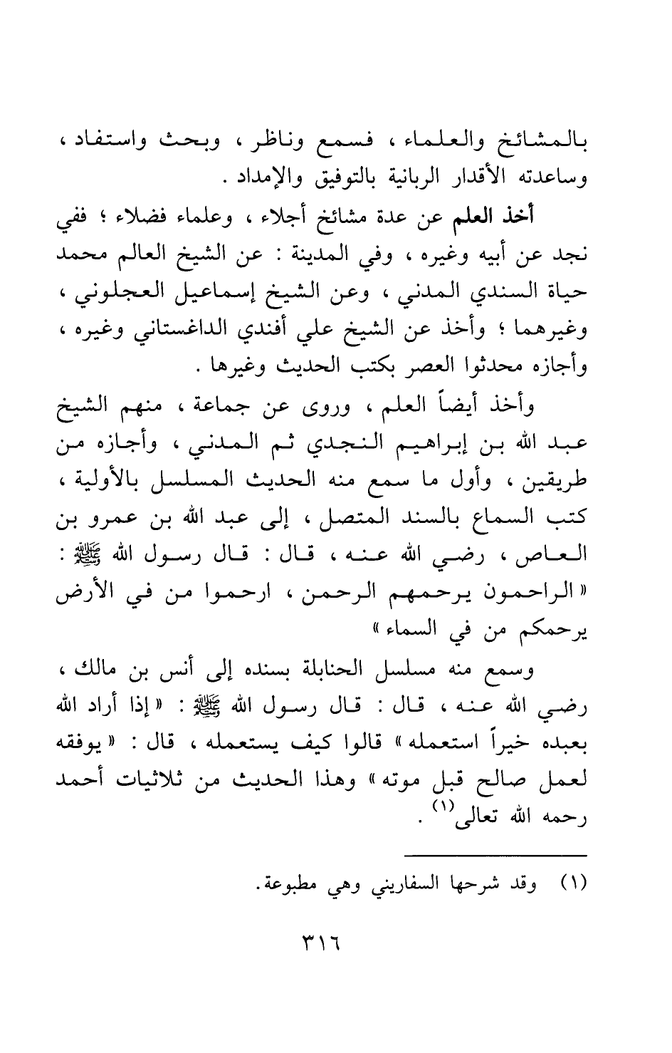 وأخذ أيضا العلم، وروى عن جماعة، منهم الشيخ عبد الله بن إبراهيم النجدي ثم المدني، وأجازه من طريقين، وأول ما سمع منه الحديث المسلسل بالأولية. كتب السماع بالسند المتصل، إلى عبد الله بن عمرو بن العاص رضي الله عنه قال: قال رسول الله صلى الله عليه وسلم: "الراحمون يرحمهم الرحمن، ارحموا من في الأرض يرحمكم من في السماء" 1.