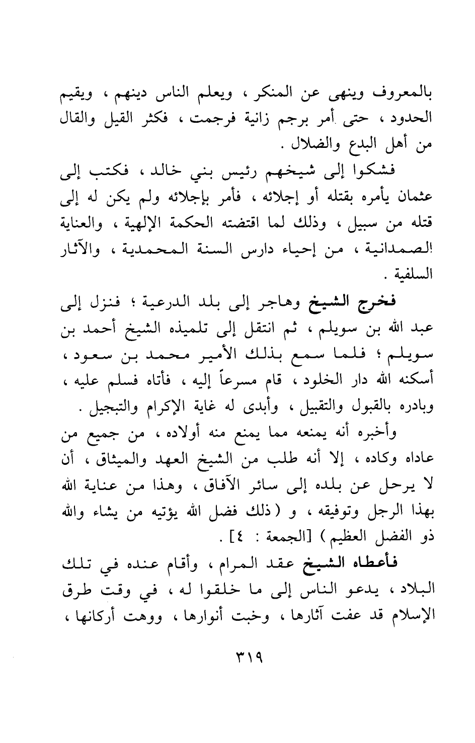 فشكوا إلى شيخهم رئيس بني خالد، فكتب إلى عثمان يأمره بقتله أو إجلائه؛ فأمر بإجلائه ولم يكن له إلى قتله من سبيل، وذلك لما اقتضته الحكمة الإلهية، والعناية الصمدانية، من إحياء دارس السنة المحمدية، والآثار السلفية.