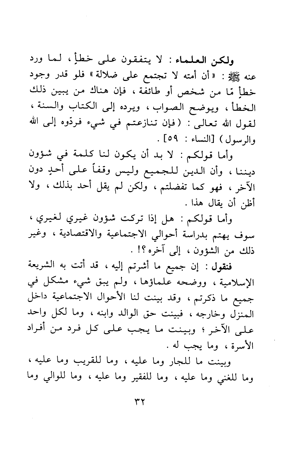 ولكن العلماء لا يتفقون على خطأ، لما ورد عنه صلى الله عليه وسلم: "أن أمته لا تجتمع على ضلالة" 1؛ فلو قدر وجود خطأ ما من شخص أو طائفة، فإن هناك من يبين ذلك الخطأ، ويوضح الصواب، ويرده إلى الكتاب والسنة، لقول الله تعالى: {فَإِنْ تَنَازَعْتُمْ فِي شَيْءٍ فَرُدُّوهُ إِلَى اللَّهِ وَالرَّسُولِ} [سورة النساء آية: 59] .