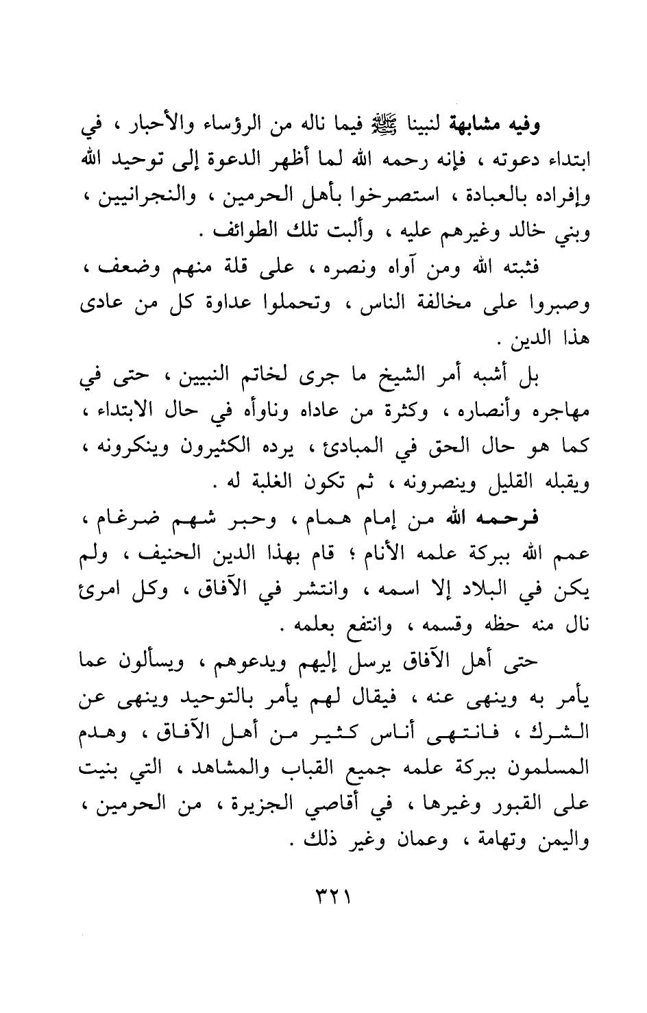 وفيه مشابهة لنبينا صلى الله عليه وسلم فيما ناله من الرؤساء والأحبار، في ابتداء دعوته؛ فإنه رحمه الله لما أظهر الدعوة إلى توحيد الله وإفراده بالعبادة، استصرخوا بأهل الحرمين، والنجرانيين، وبني خالد وغيرهم عليه، وألبت تلك الطوائف.