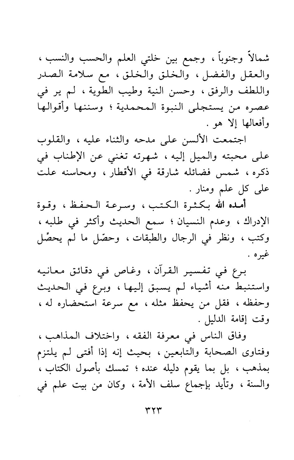 شمالا وجنوبا. وجمع بين خلتي العلم والحسب والنسب، والعقل والفضل، والخلق والخلق، مع سلامة الصدر واللطف والرفق، وحسن النية وطيب الطوية، لم ير في عصره من يستجلي النبوة المحمدية، وسننها وأقوالها وأفعالها إلا هو.