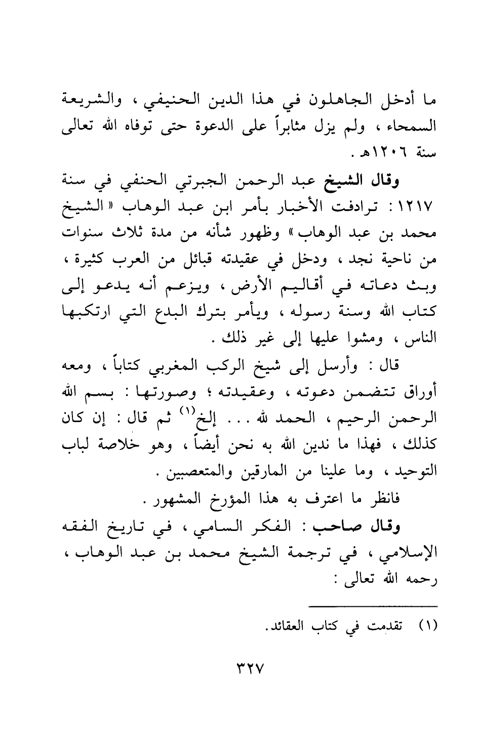 وقال صاحب الفكر السامي في تاريخ الفقه الإسلامي، في ترجمة الشيخ محمد بن عبد الوهاب، رحمه الله تعالى: