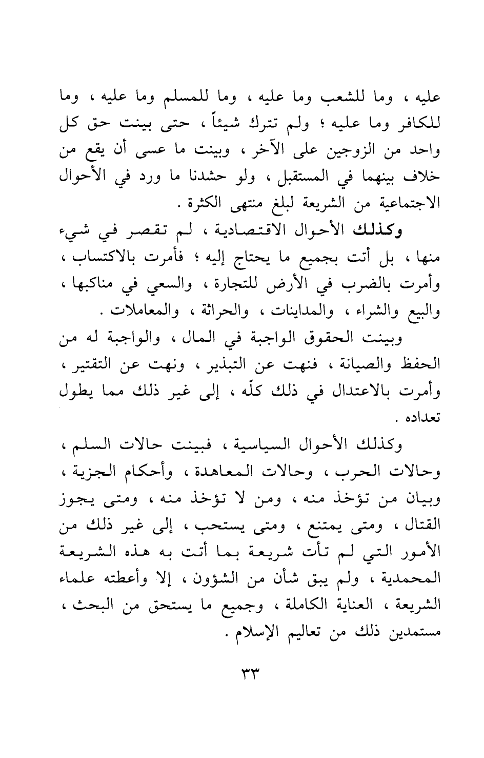 وكذلك الأحوال السياسية، فبينت حالات السلم، وحالات الحرب، وحالات المعاهدة، وأحكام الجزية، وبيان من تؤخذ منه، ومن لا تؤخذ منه، ومتى يجوز القتال، ومتى يمتنع، ومتى يستحب، إلى غير ذلك من الأمور التي لم تأت شريعة بما أتت به هذه الشريعة المحمدية؛ ولم يبق شأن من الشؤون إلا وأعطاه علماء الشريعة العناية الكاملة، وجميع ما يستحق من البحث، مستمدين ذلك من تعاليم الإسلام.