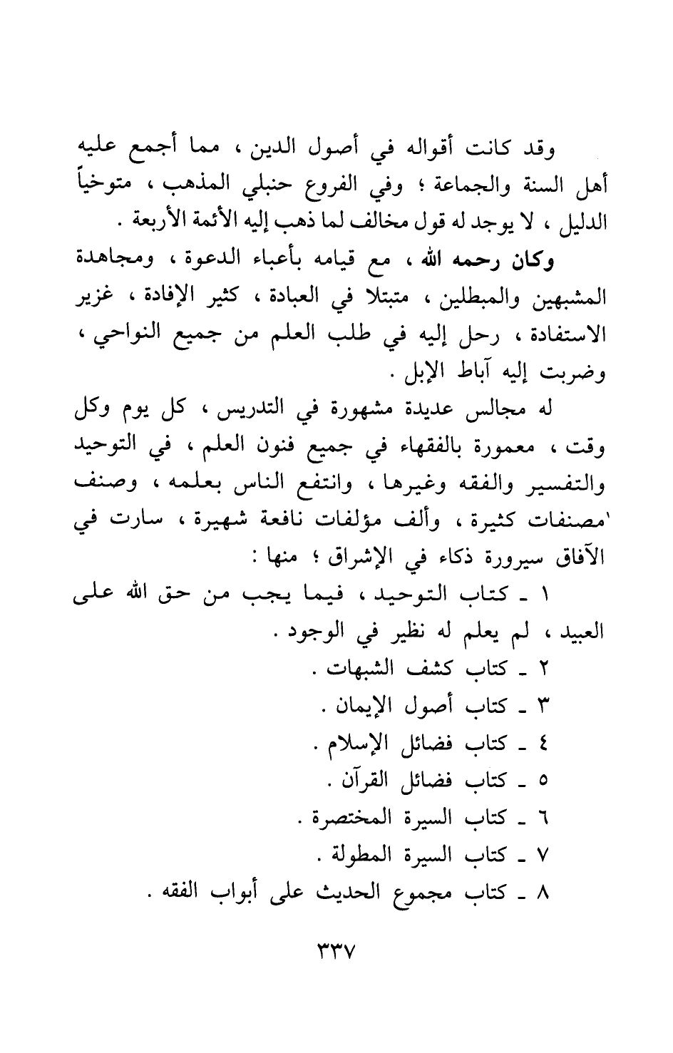وكان رحمه الله، مع قيامه بأعباء الدعوة، ومجاهدة المشبهين والمبطلين، متبتلا في العبادة، كثير الإفادة، غزير الاستفادة، رحل إليه في طلب العلم من جميع النواحي، وضربت إليه آباط الإبل.