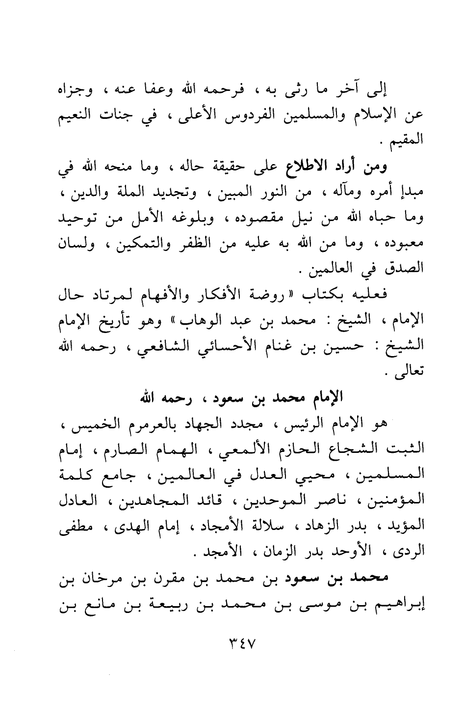 ومن أراد الاطلاع على حقيقة حاله، وما منحه الله في مبدإ أمره ومآله، من النور المبين، وتجديد الملة والدين، وما حباه الله من نيل مقصوده، وبلوغه الأمل من توحيد معبوده، وما من الله به عليه من الظفر والتمكين، ولسان الصدق في العالمين، فعليه بكتاب "روضة الأفكار والأفهام لمرتاد حال الإمام، الشيخ: محمد بن عبد الوهاب" وهو تأريخ الإمام الشيخ: حسين بن غنام الأحسائي الشافعي، رحمه الله تعالى.