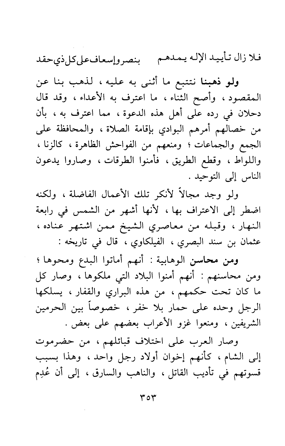 ولو وجد مجالا لأنكر تلك الأعمال الفاضلة، ولكنه اضطر إلى الاعتراف بها، لأنها أشهر من الشمس في رابعة النهار. وقبله من معاصري الشيخ ممن اشتهر عناده، عثمان بن سند البصري، الفيلكاوي، قال في تاريخه: ومن محاسن الوهابية: أنهم أماتوا البدع ومحوها، ومن محاسنهم: أنهم أمنوا البلاد التي ملكوها، وصار كل ما كان تحت حكمهم، من هذه البراري والقفار، يسلكها الرجل وحده على حمار بلا خفر، خصوصا بين الحرمين الشريفين، ومنعوا غزو الأعراب بعضهم على بعض.
