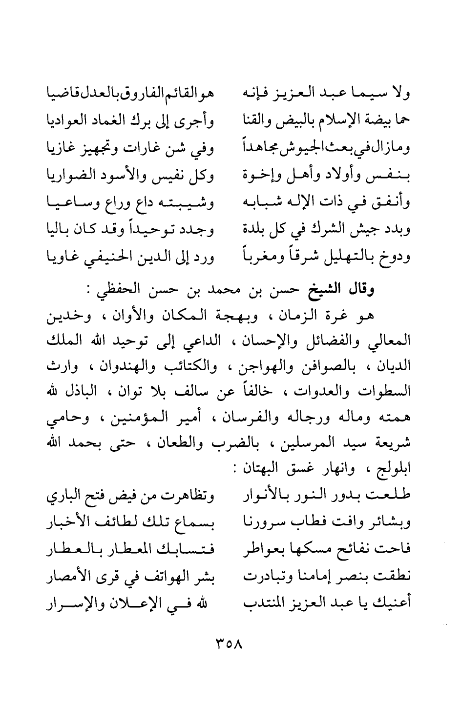 وقال الشيخ حسن بن محمد بن حسن الحفظي: هو غرة الزمان، وبهجة المكان والأوان، وخدين المعالي والفضائل والإحسان، الداعي إلى توحيد الله الملك الديان، بالصوافن والهواجن، والكتائب والهندوان، وارث السطوات والعدوات، خالفا عن سالف بلا توان، الباذل لله همته وماله ورجاله والفرسان، أمير المؤمنين، وحامي شريعة سيد المرسلين، بالضرب والطعان، حتى بحمد الله ابلولج، وانهار غسق البهتان: