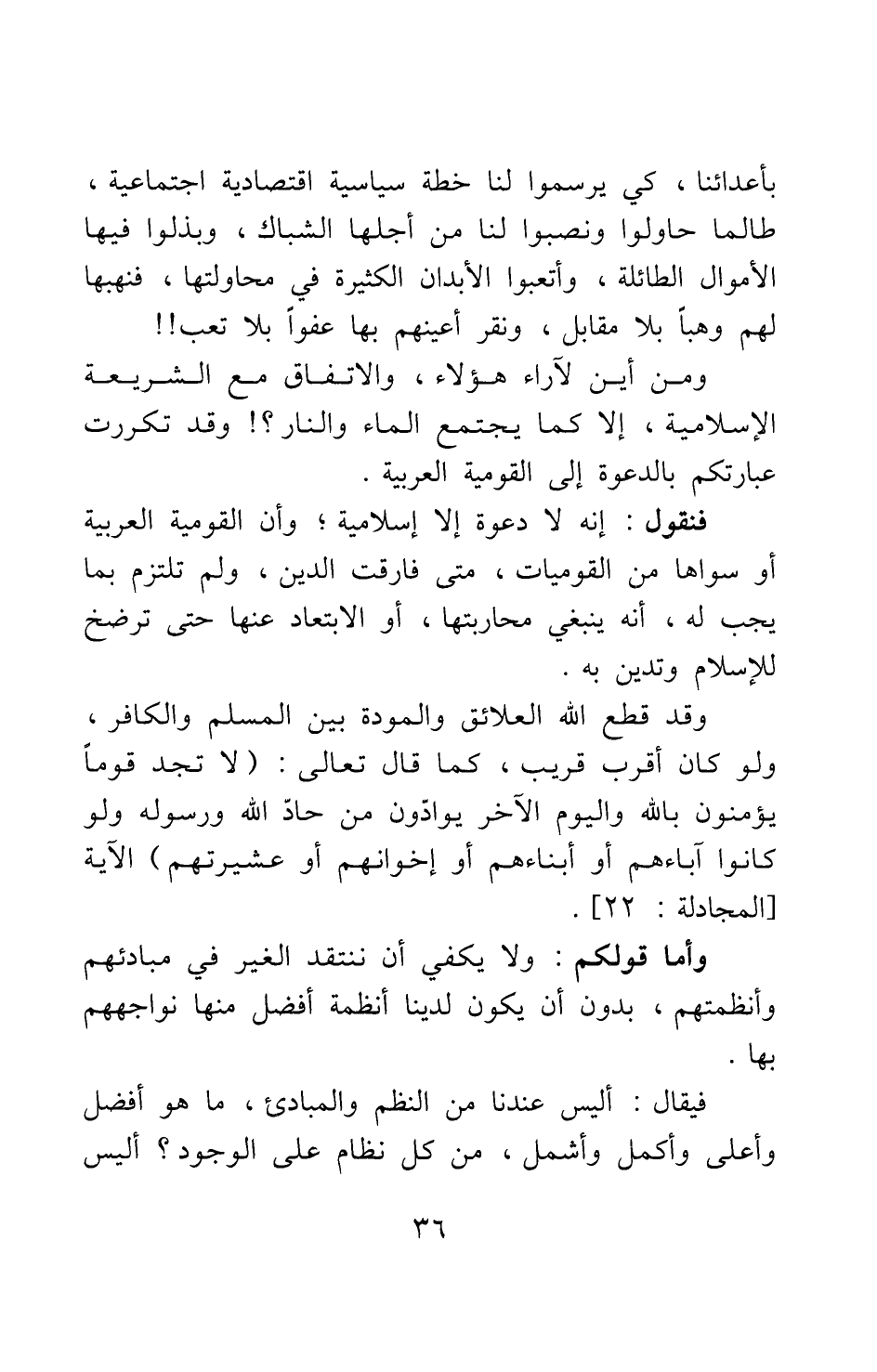 بأعدائنا،?كي يرسموا لنا خطة سياسية اقتصادية اجتماعية، طالما حاولوا ونصبوا لنا من أجلها الشباك، وبذلوا فيها الأموال الطائلة، وأتعبوا الأبدان الكثيرة في محاولتها، فنهبها لهم وهبا بلا مقابل، ونقر أعينهم بها عفوا بلا تعب!! ومن أين لآراء هؤلاء والاتفاق مع الشريعة الإسلامية، إلا كما يجتمع الماء والنار؟! وقد تكررت عبارتكم بالدعوة إلى القومية العربية. فنقول: إنه لا دعوة إلا إسلامية، وأن القومية العربية أو سواها من القوميات، متى فارقت الدين، ولم تلتزم بما يجب له، أنه ينبغي محاربتها، أو الابتعاد عنها حتى ترضخ للإسلام وتدين به. وقد قطع الله العلائق والمودة بين المسلم والكافر، ولو كان أقرب قريب، كما قال تعالى: {لا تَجِدُ قَوْماً يُؤْمِنُونَ بِاللَّهِ وَالْيَوْمِ الْآخِرِ يُوَادُّونَ مَنْ حَادَّ اللَّهَ وَرَسُولَهُ وَلَوْ كَانُوا آبَاءَهُمْ أَوْ أَبْنَاءَهُمْ أَوْ إِخْوَانَهُمْ أَوْ عَشِيرَتَهُمْ} [سورة المجادلة آية: 22] الآية.