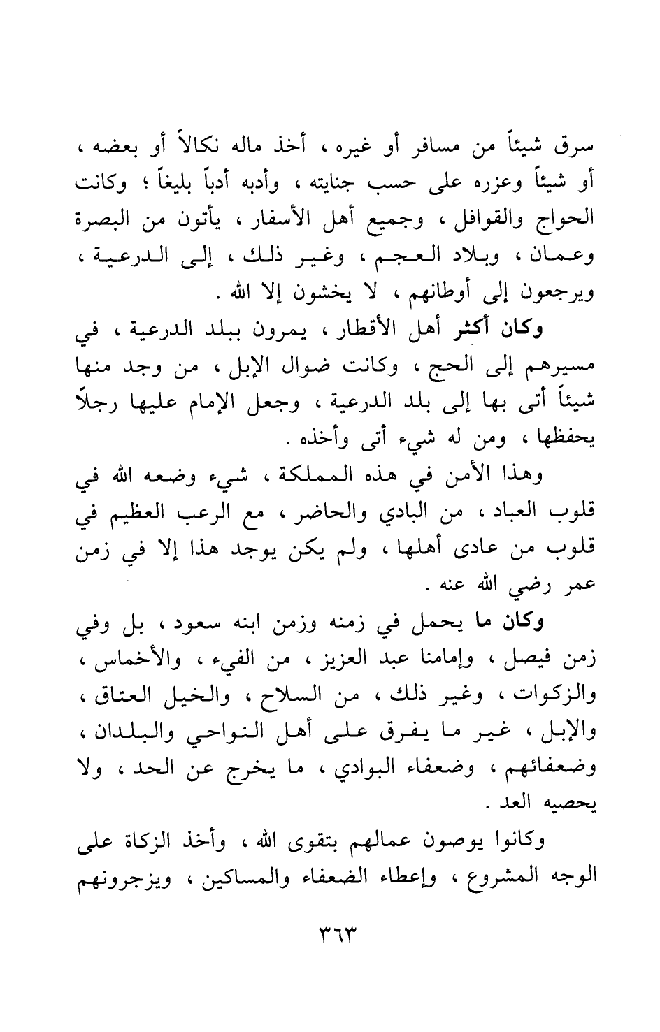 سرق شيئا من مسافر أو غيره، أخذ ماله نكالا أو بعضه أو شيئا، وعزره على حسب جنايته، وأدبه أدبا بليغا. وكانت الحواج والقوافل وجميع أهل الأسفار، يأتون من البصرة وعمان، وبلاد العجم، وغير ذلك، إلى الدرعية، ويرجعون إلى أوطانهم، لا يخشون إلا الله.