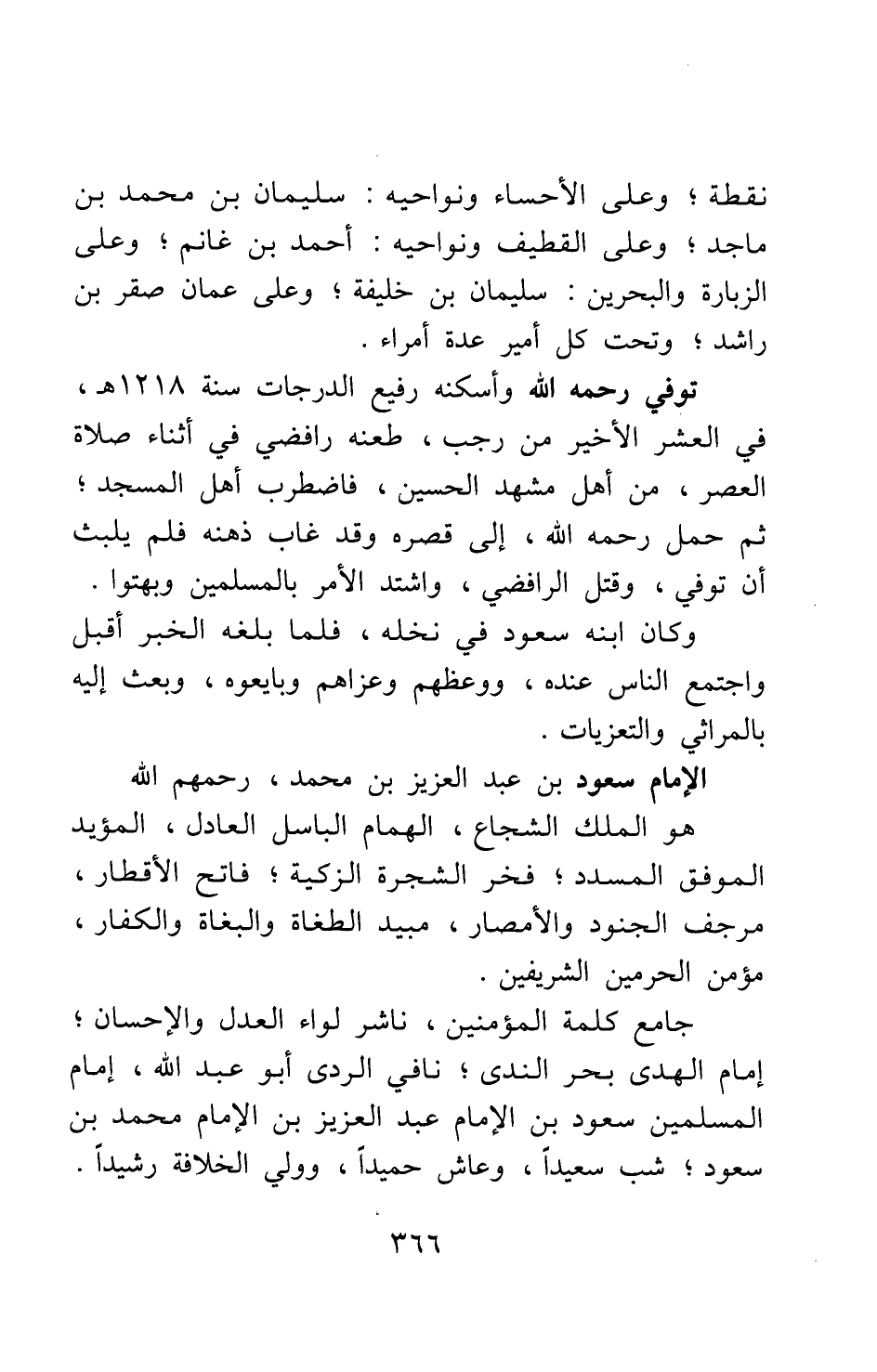 جامع كلمة المؤمنين، ناشر لواء العدل والإحسان، إمام الهدى بحر الندى، نافي الردى: أبو عبد الله، إمام المسلمين سعود بن الإمام عبد العزيز بن الإمام محمد بن سعود، شب سعيدا، وعاش حميدا، وولي الخلافة رشيدا.