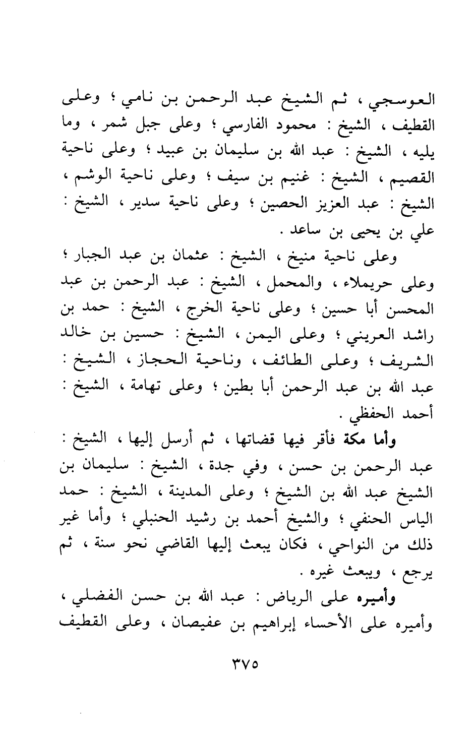 العوسجي، ثم الشيخ عبد الرحمن بن نامي، وعلى القطيف الشيخ: محمود الفارسي، وعلى جبل شمر وما يليه الشيخ: عبد الله بن سليمان بن عبيد، وعلى ناحية القصيم الشيخ: غنيم بن سيف، وعلى ناحية الوشم الشيخ: عبد العزيز الحصين، وعلى ناحية سدير الشيخ: علي بن يحيى بن ساعد، وعلى ناحية منيخ الشيخ: عثمان بن عبد الجبار، وعلى حريملاء والمحمل الشيخ: عبد الرحمن بن عبد المحسن أبا حسين، وعلى ناحية الخرج الشيخ: حمد بن راشد العريني، وعلى اليمن الشيخ: حسين بن خالد الشريف، وعلى الطائف وناحية الحجاز الشيخ: عبد الله بن عبد الرحمن أبا بطين، وعلى تهامة الشيخ: أحمد الحفظي؛ وأما مكة فأقر فيها قضاتها، ثم أرسل إليها الشيخ: عبد الرحمن بن حسن، وفي جدة الشيخ: سليمان بن الشيخ عبد الله بن الشيخ; وعلى المدينة الشيخ: حمد إلياس الحنفي، والشيخ أحمد بن رشيد الحنبلي؛ وأما غير ذلك من النواحي، فكان يبعث إليها القاضي نحو سنة، ثم يرجع، ويبعث غيره، وأميره على الرياض: عبد الله بن حسن الفضلي، وأميره على الأحساء إبراهيم بن عفيصان، وعلى القطيف