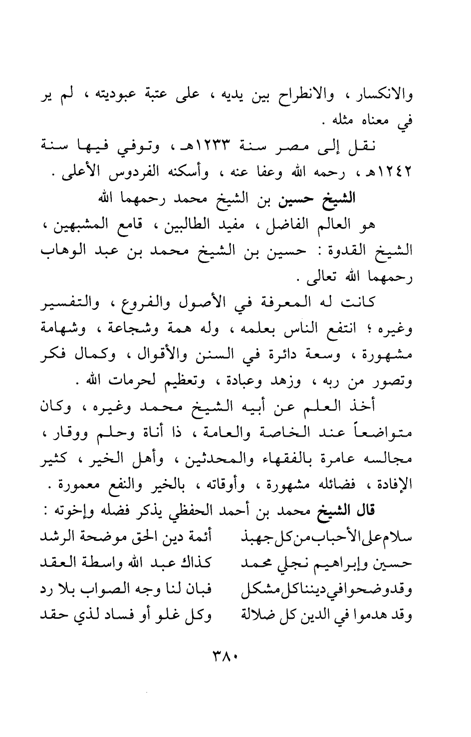 هو العالم الفاضل، مفيد الطالبين، قامع المشبهين، الشيخ القدوة: حسين بن الشيخ محمد بن عبد الوهاب رحمهما الله تعالى. كانت له المعرفة في الأصول والفروع، والتفسير وغيره. انتفع الناس بعلمه. وله همة وشجاعة، وشهامة مشهورة، وسمعة دائرة في السنن والأقوال، وكمال فكر وتصور من ربه، وزهد وعبادة، وتعظيم لحرمات الله.