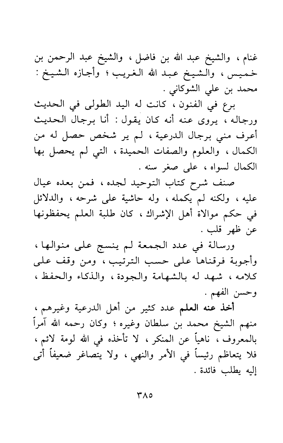 برع في الفنون، كانت له اليد الطولى في الحديث ورجاله؛ يروى عنه أنه كان يقول: أنا برجال الحديث أعرف مني برجال الدرعية. لم ير شخص حصل له من الكمال والعلوم، والصفات الحميدة، التي لم يحصل بها الكمال لسواه، على صغر سنه.