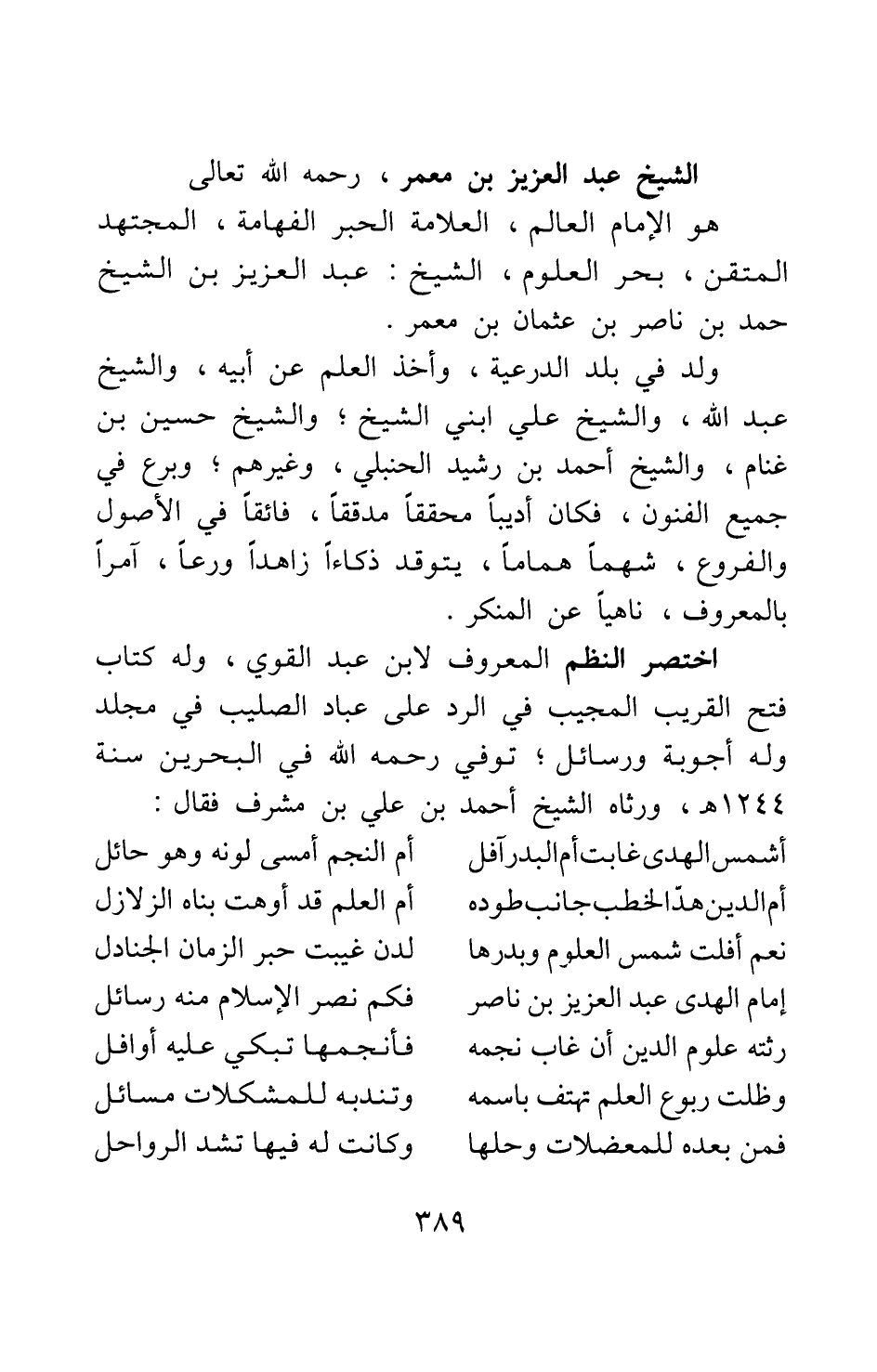 إمام الهدى عبد العزيز بن ناصر ... رثته علوم الدين أن غاب نجمه