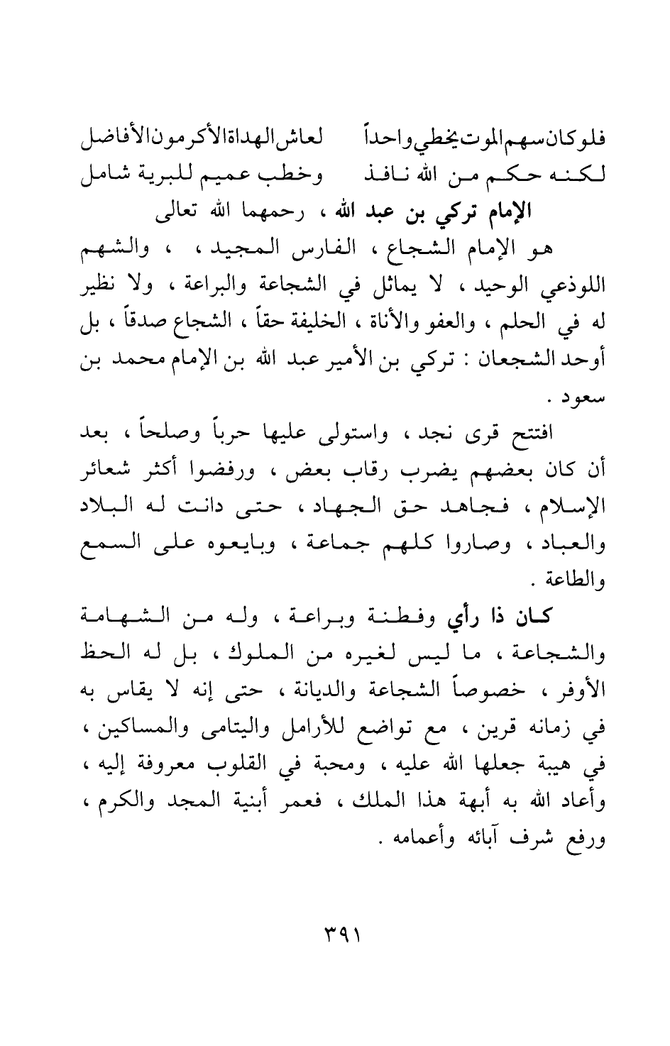 هو الإمام الشجاع، الفارس المجيد، والشهم اللوذعي الوحيد، لا يماثل في الشجاعة والبراعة، ولا نظير له في الحلم والعفو والأناة، الخليفة حقا، الشجاع صدقا، بل أوحد الشجعان: تركي بن الأمير عبد الله بن الإمام محمد بن سعود.
