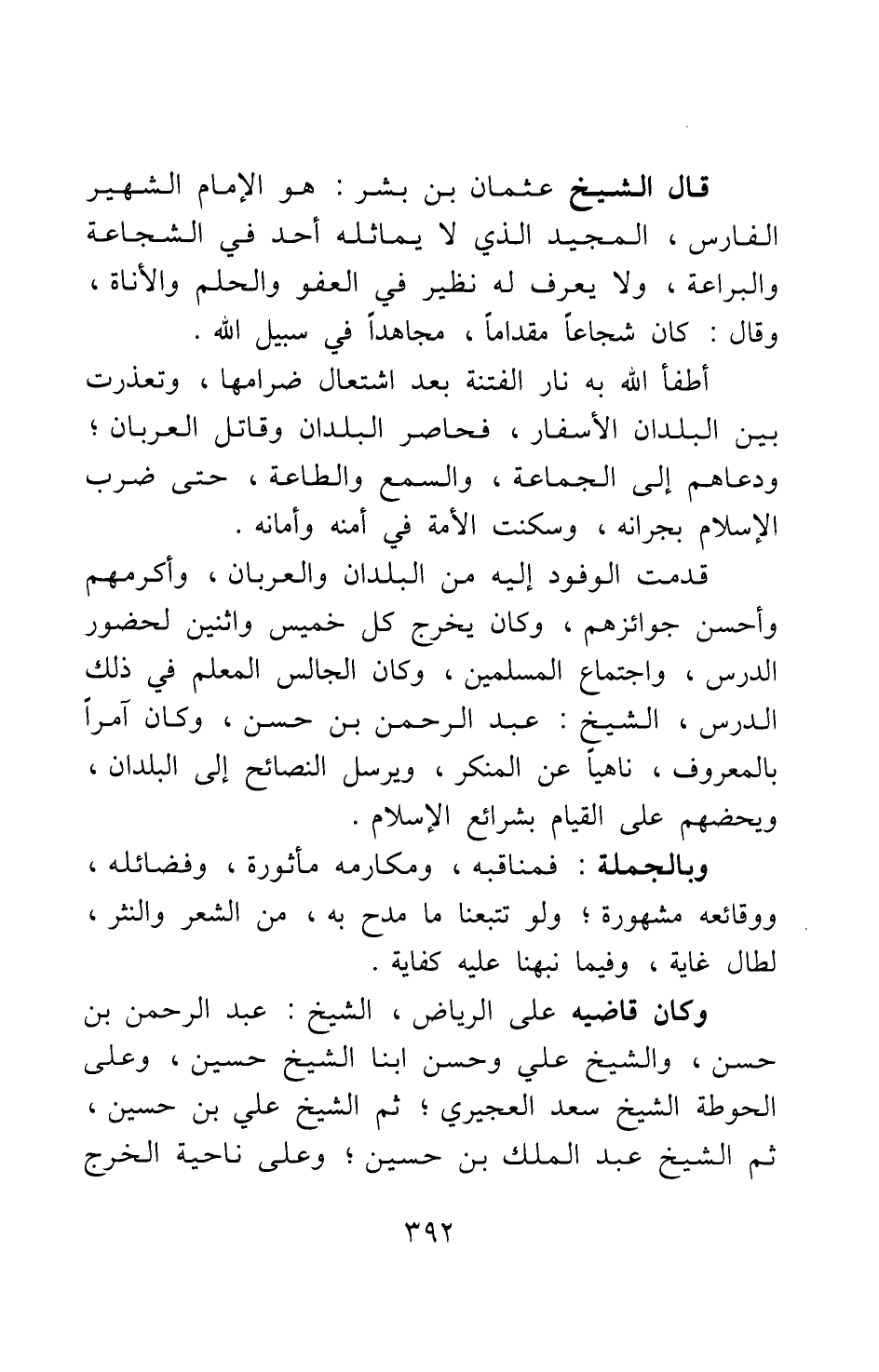قال الشيخ عثمان بن بشر: هو الإمام الشهير الفارس، المجيد الذي لا يماثله أحد في الشجاعة والبراعة، ولا يعرف له نظير في العفو والحلم والأناة. وقال: كان شجاعا مقداما، مجاهدا في سبيل الله.
