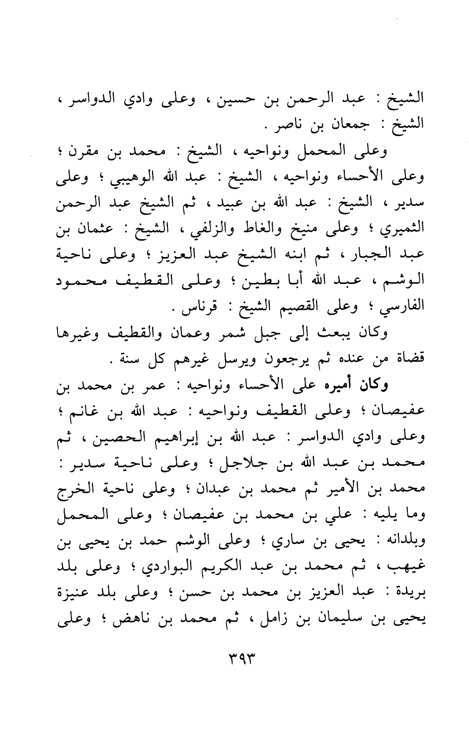 وكان أميره على الأحساء ونواحيه: عمر بن محمد بن عفيصان، وعلى القطيف ونواحيه: عبد الله بن غانم، وعلى وادي الدواسر: عبد الله بن إبراهيم الحصين، ثم محمد بن عبد الله بن جلاجل، وعلى ناحية سدير: محمد بن الأمير، ثم محمد بن عبدان، وعلى ناحية الخرج وما يليه: علي بن محمد بن عفيصان، وعلى المحمل وبلدانه: يحيى بن ساري، وعلى الوشم: حمد بن يحيى بن غيهب، ثم محمد بن عبد الكريم البواردي، وعلى بلد بريدة: عبد العزيز بن محمد بن حسن; وعلى بلد عنيزة: يحيى بن سليمان بن زامل، ثم محمد بن ناهض، وعلى