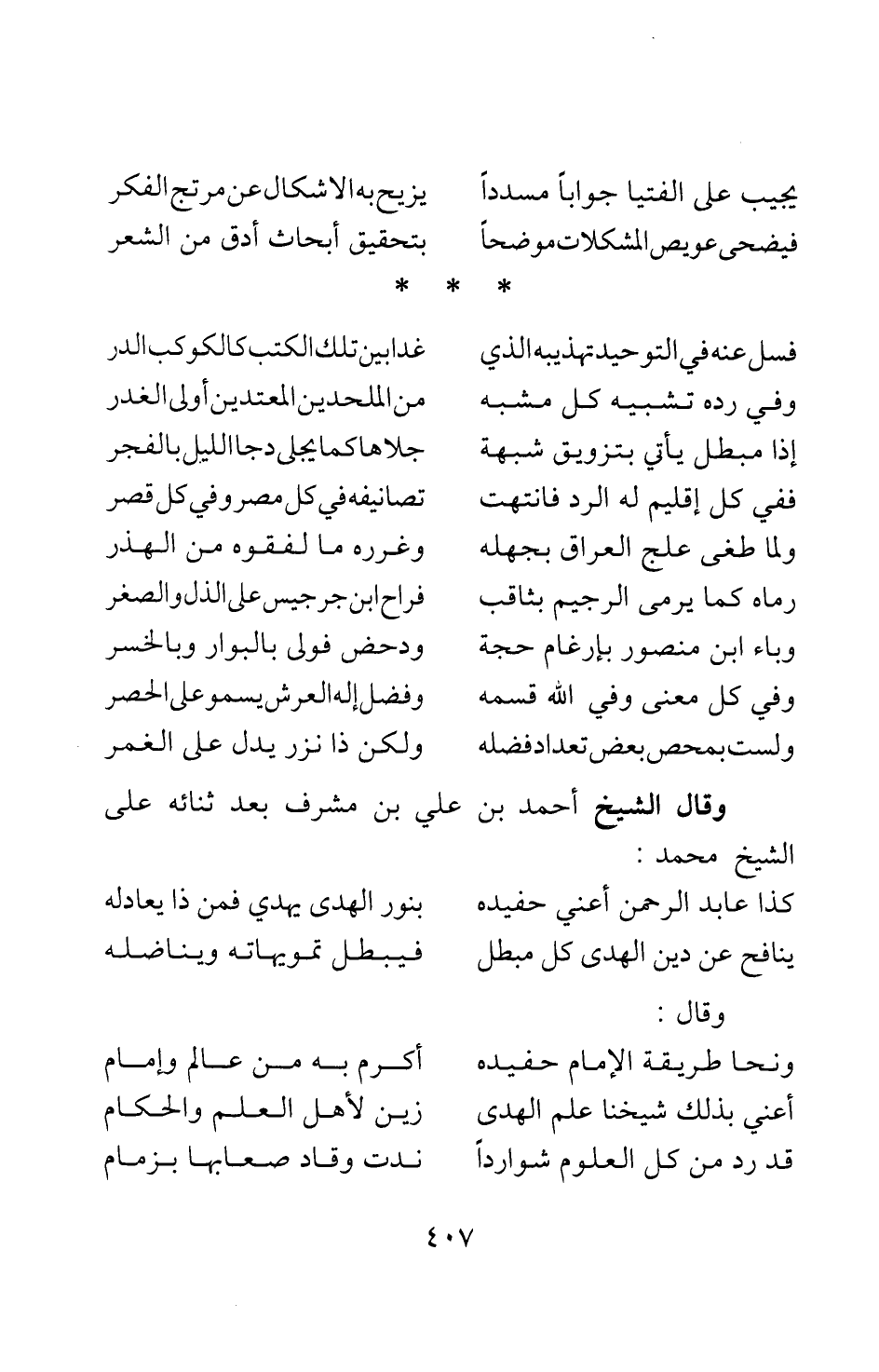 وقال الشيخ أحمد بن علي بن مشرف بعد ثنائه على الشيخ محمد: