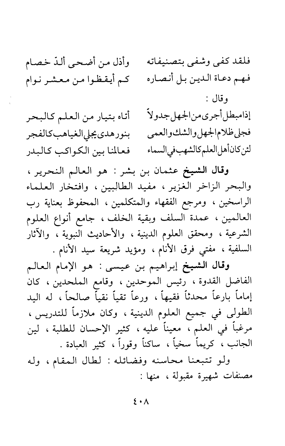وقال الشيخ عثمان بن بشر: هو العالم النحرير، والبحر الزاخر الغزير، مفيد الطالبين، وافتخار العلماء الراسخين، ومرجع الفقهاء والمتكلمين، المحفوظ بعناية رب العالمين، عمدة السلف وبقية الخلف، جامع أنواع العلوم الشرعية، ومحقق العلوم الدينية، والأحاديث النبوية، والآثار السلفية، مفتي فرق الأنام، ومؤيد شريعة سيد الأنام.