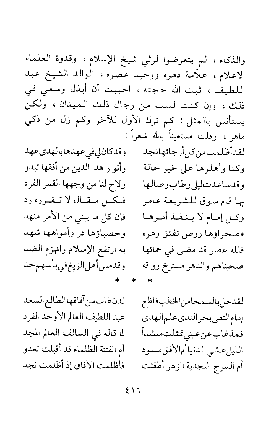 والذكاء لم يتعرضوا لرثي شيخ الإسلام، وقدوة العلماء الأعلام، علامة دهره ووحيد عصره، الوالد الشيخ عبد اللطيف، ثبت الله حجته، أحببت أن أبذل وسعي في ذلك، وإن كنت لست من رجال ذلك الميدان، ولكن يستأنس بالمثل: كم ترك الأول للآخر، وكم زل من ذكي ماهر، وقلت مستعينا بالله شعرا: