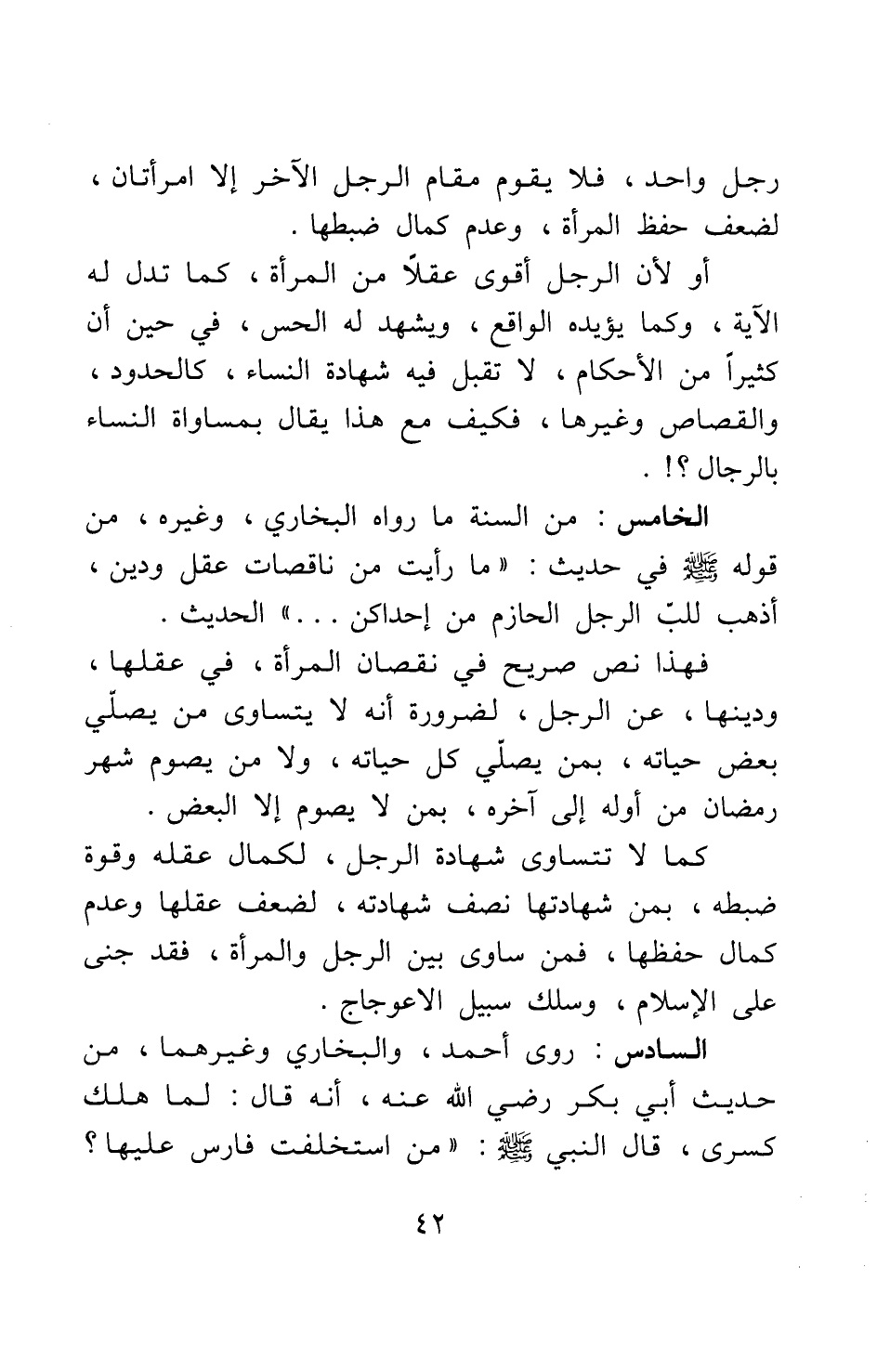 الخامس: من السنة ما رواه البخاري، وغيره، من قوله صلى الله عليه وسلم في حديث: "ما رأيت من ناقصات عقل ودين، أذهب للب الرجل الحازم من إحداكن ... " 1 الحديث. فهذا نص صريح في نقصان المرأة في عقلها ودينها عن الرجل، لضرورة أنه لا يتساوى من يصلي بعض حياته، بمن يصلي كل حياته، ولا من يصوم شهر رمضان من أوله إلى آخره، بمن لا يصوم إلا البعض. كما لا تتساوى شهادة الرجل، لكمال عقله وقوة ضبطه، بمن شهادتها نصف شهادته، لضعف عقلها وعدم كمال حفظها. فمن ساوى بين الرجل والمرأة، فقد جنى على الإسلام، وسلك سبيل الاعوجاج.