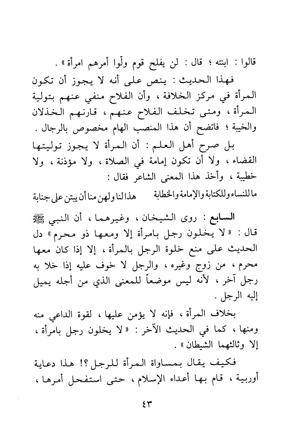 فهذا الحديث ينص على أنه لا يجوز أن تكون المرأة في مركز الخلافة، وأن الفلاح منفي عنهم بتولية المرأة؛ ومتى تخلف الفلاح عنهم، قارنهم الخذلان والخيبة; فاتضح أن هذا المنصب الهام مخصوص بالرجال. بل صرح أهل العلم أن المرأة لا يجوز توليتها القضاء، ولا أن تكون إمامة في الصلاة، ولا مؤذنة، ولا خطيبة، وأخذ هذا المعنى الشاعر فقال: