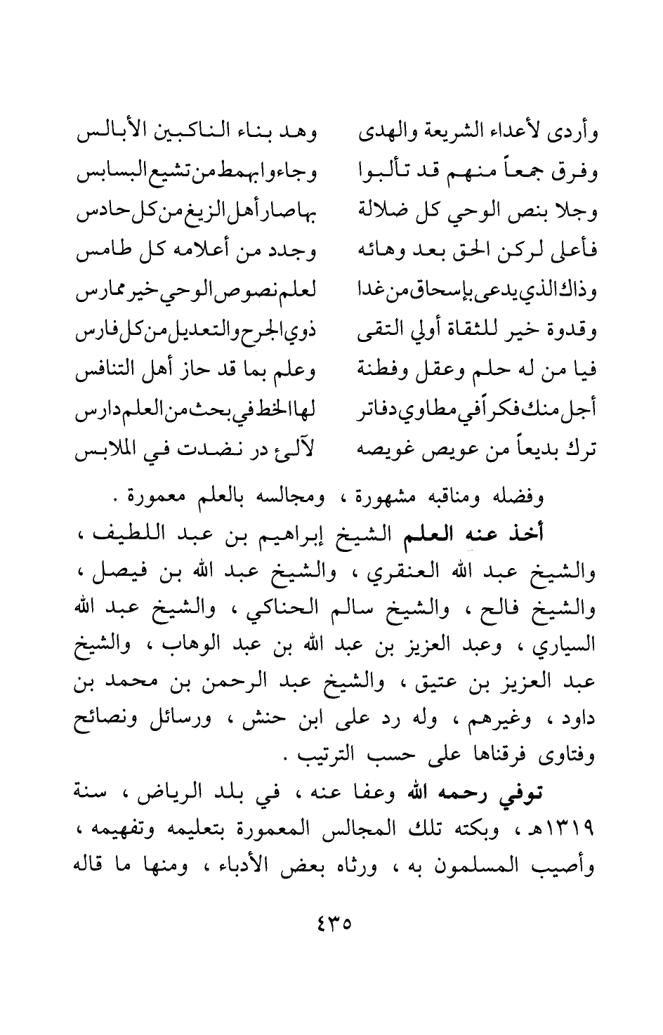وفضله ومناقبه مشهورة، ومجالسه بالعلم معمورة. أخذ عنه العلم الشيخ إبراهيم بن عبد اللطيف، والشيخ عبد الله العنقري، والشيخ عبد الله بن فيصل، والشيخ فالح، والشيخ سالم الحناكي، والشيخ عبد الله السياري، وعبد العزيز بن عبد الله بن عبد الوهاب، والشيخ عبد العزيز بن عتيق، والشيخ عبد الرحمن بن محمد بن داود، وغيرهم. وله رد على ابن حنش، ورسائل ونصائح وفتاوى فرقناها على حسب الترتيب.