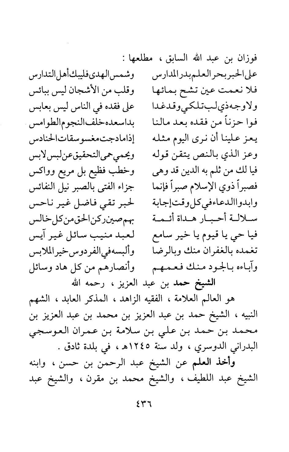 هو العالم العلامة، الفقيه الزاهد، المذكر العابد، الشهم النبيه، الشيخ حمد بن عبد العزيز بن محمد بن عبد العزيز بن محمد بن حمد بن علي بن سلامة بن عمران العوسجي البدراني الدوسري، ولد سنة 1245?، في بلدة ثادق.