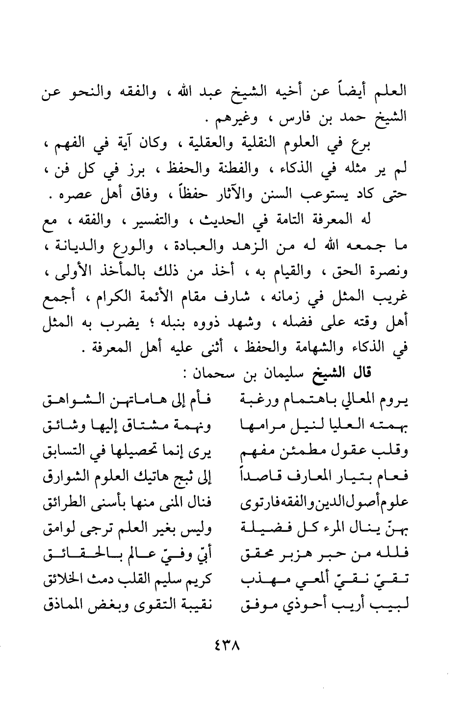 له المعرفة التامة في الحديث، والتفسير، والفقه، مع ما جمعه الله له من الزهد والعبادة، والورع والديانة، ونصرة الحق، والقيام به. أخذ من ذلك بالمأخذ الأولى، غريب المثل في زمانه، شارف مقام الأئمة الكرام. أجمع أهل وقته على فضله، وشهد ذووه بنبله; يضرب به المثل فى الذكاء والشهامة والحفظ، أثنى عليه أهل المعرفة. قال الشيخ سليمان بن سحمان: