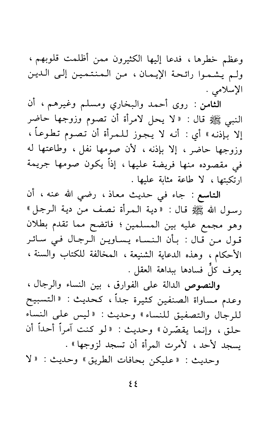 الثامن: روى أحمد والبخاري ومسلم وغيرهم، أن النبي صلى الله عليه وسلم قال: "لا يحل لامرأة أن تصوم وزوجها حاضر إلا بإذنه" 1 أي: أنه لا يجوز للمرأة أن تصوم تطوعا، وزوجها حاضر، إلا بإذنه، لأن صومها نفل، وطاعتها له في مقصوده منها فريضة عليها، إذاً يكون صومها جريمة ارتكبتها، لا طاعة مثابة عليها.