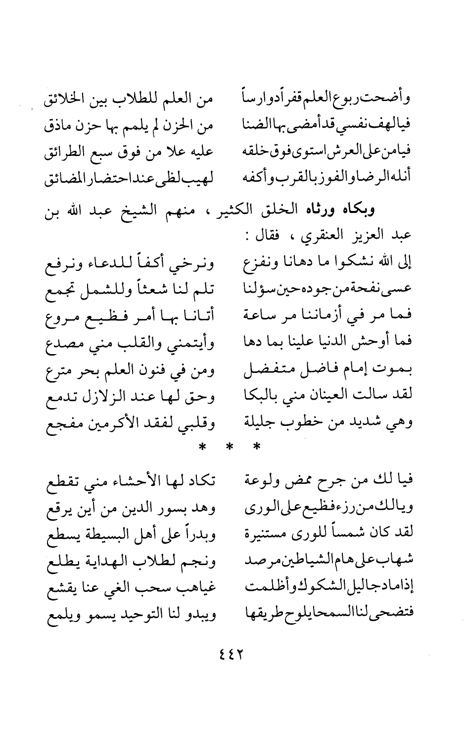 وبكاه ورثاه الخلق الكثير، منهم الشيخ عبد الله بن عبد العزيز العنقري، فقال: