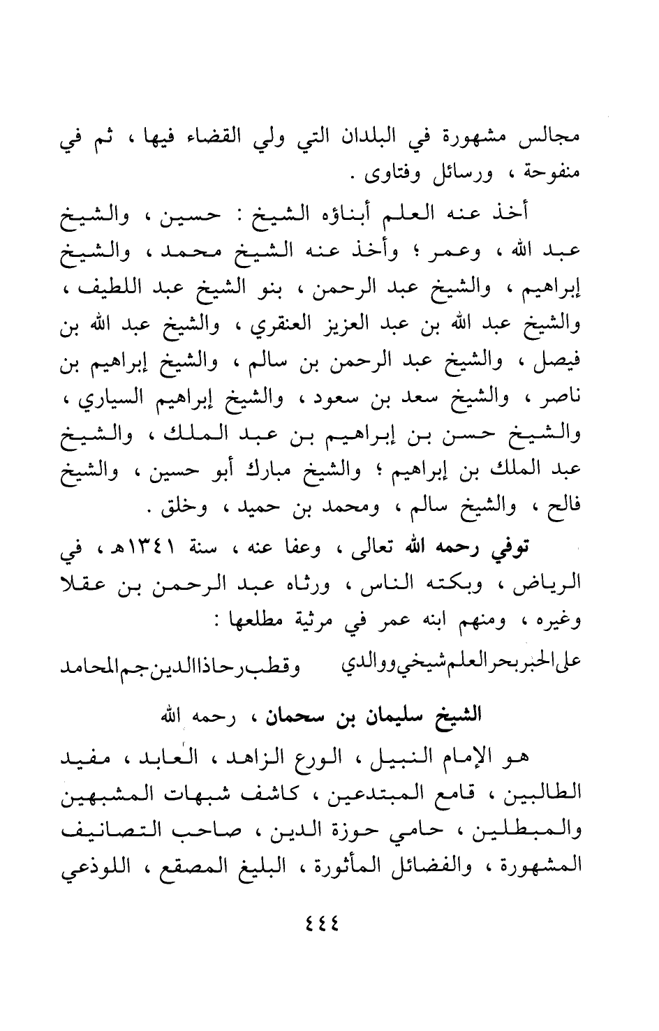 مجالس مشهورة في البلدان التي ولي القضاء فيها، ثم في منفوحة، ورسائل وفتاوى.
