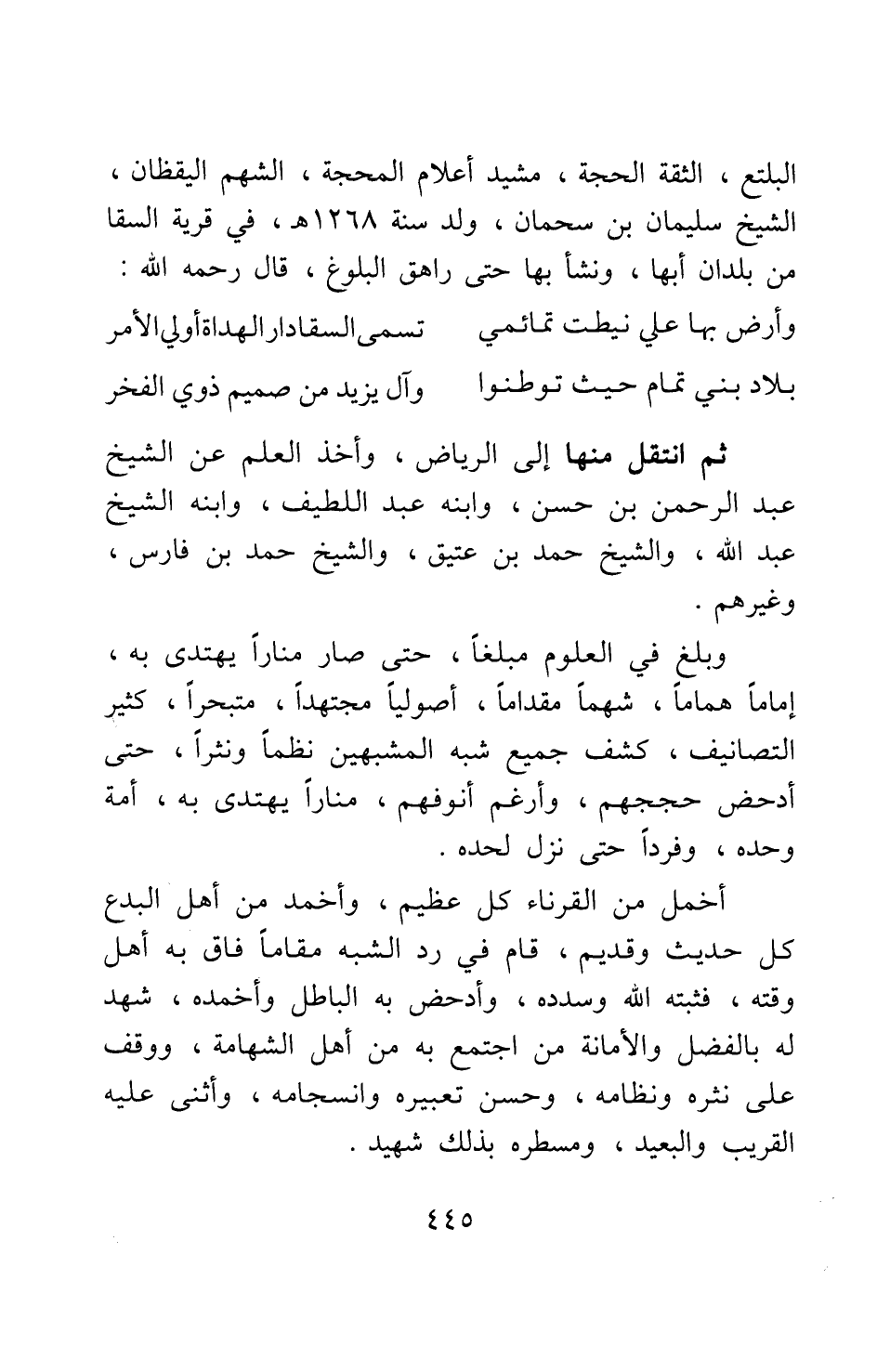 البلتع، الثقة الحجة، مشيد أعلام المحجة، الشهم اليقظان، الشيخ سليمان بن سحمان، ولد سنة 1268?، في قرية السقا من بلدان أبها، ونشأ بها حتى راهق البلوغ، قال رحمه الله: