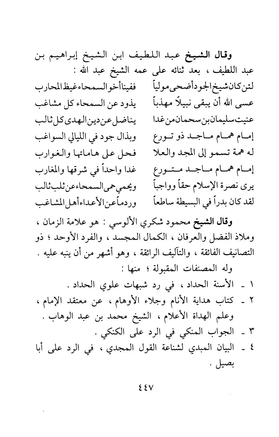 وقال الشيخ عبد اللطيف بن الشيخ إبراهيم بن عبد اللطيف، بعد ثنائه على عمه الشيخ عبد الله: