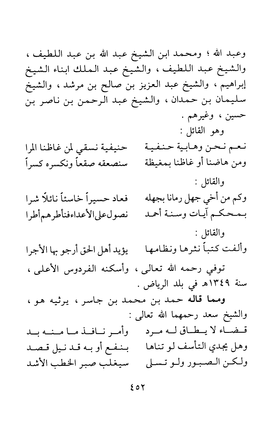 وعبد الله، ومحمد بن الشيخ عبد الله بن عبد اللطيف، والشيخ عبد اللطيف، والشيخ عبد الملك أبناء الشيخ إبراهيم، والشيخ عبد العزيز بن صالح بن مرشد، والشيخ سليمان بن حمدان، والشيخ عبد الرحمن بن ناصر بن حسين، وغيرهم. وهو القائل: