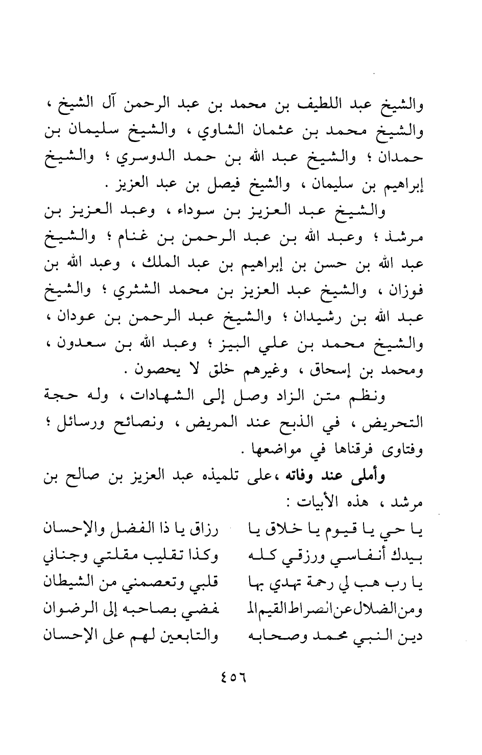 والشيخ عبد اللطيف بن محمد بن عبد الرحمن آل الشيخ، والشيخ محمد بن عثمان الشاوي، والشيخ سليمان بن حمدان، والشيخ عبد الله بن حمد الدوسري، والشيخ إبراهيم بن سليمان، والشيخ فيصل بن عبد العزيز، والشيخ عبد العزيز بن سوداء، وعبد العزيز بن مرشد، وعبد الله بن عبد الرحمن بن غنام، والشيخ عبد الله بن حسن بن إبراهيم بن عبد الملك، وعبد الله بن فوزان، والشيخ عبد العزيز بن محمد الشثري، والشيخ عبد الله بن رشيدان، والشيخ عبد الرحمن بن عودان، والشيخ محمد بن علي البيز، وعبد الله بن سعدون، ومحمد بن إسحاق، وغيرهم خلق لا يحصون.