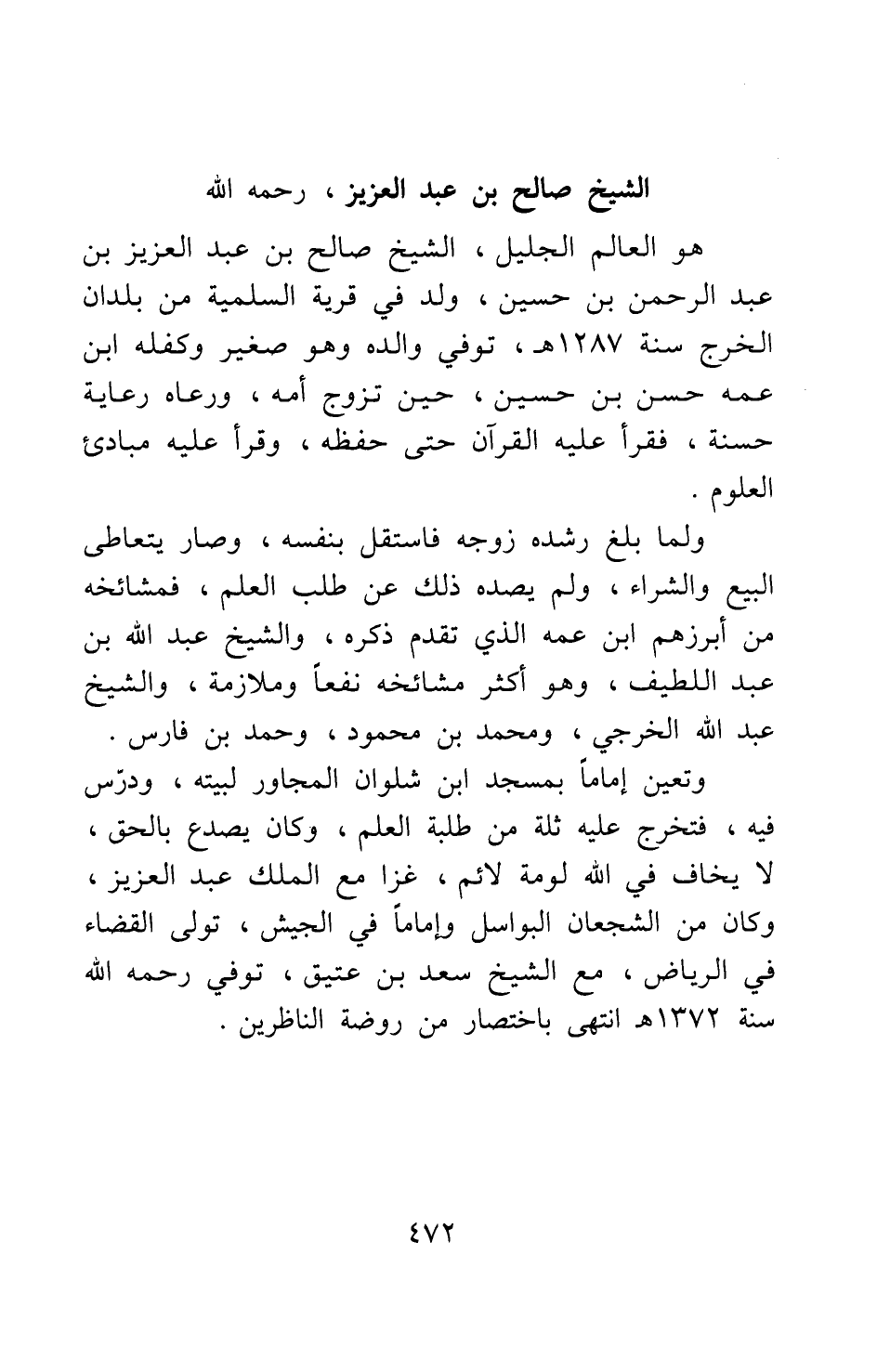 هو العالم الجليل، الشيخ صالح بن عبد العزيز بن عبد الرحمن بن حسين، ولد في قرية السلمية من بلدان الخرج سنة 1287?، توفي والده وهو صغير وكفله ابن عمه حسن بن حسين، حين تزوج أمه، ورعاه رعاية حسنة، فقرأ عليه القرآن حتى حفظه، وقرأ عليه مبادئ العلوم.