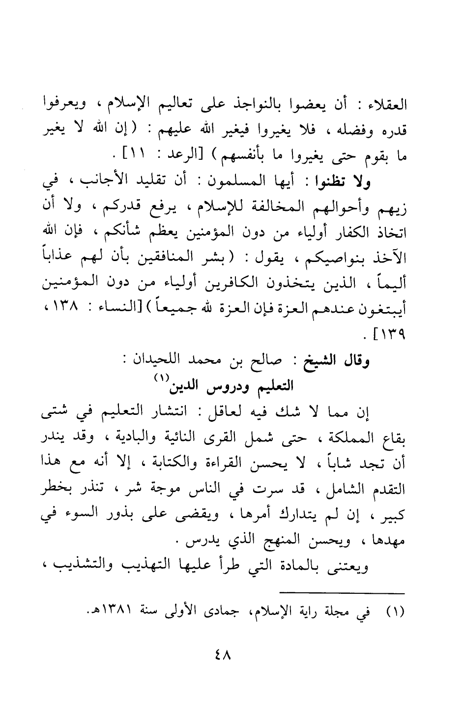 وقال الشيخ صالح بن محمد اللحيدان: التعليم ودروس الدين1