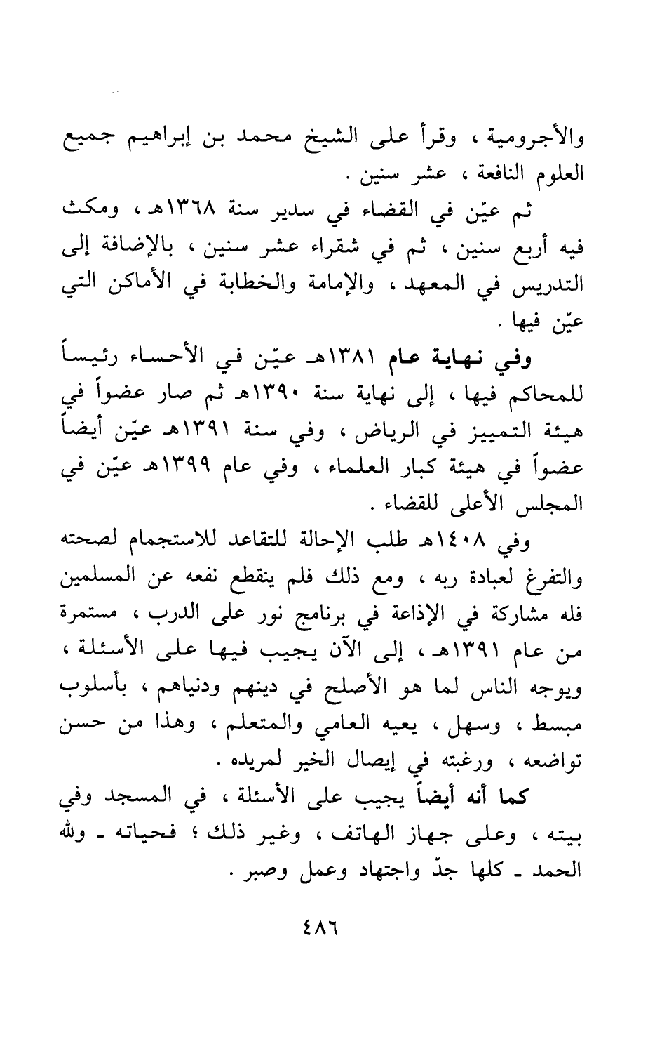 وفي نهاية عام 1381? عيّن في الأحساء رئيسا للمحاكم فيها، إلى نهاية سنه 1390هـ ثم صار عضوا في هيئة التمييز في الرياض، وفي سنة 1391هـ عيّن أيضا عضوا في هيئة كبار العلماء، وفي عام 1399هـ عيّن في المجلس الأعلى للقضاء.