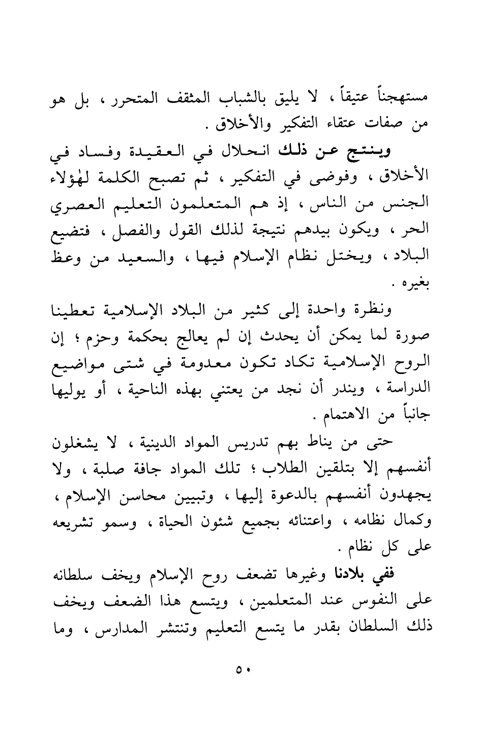 ونظرة واحدة إلى كثير من البلاد الإسلامية تعطينا صورة لما يمكن أن يحدث إن لم يعالج بحكمة وحزم; إن الروح الإسلامية تكاد تكون معدومة في شتى مواضيع الدراسة، ويندر أن نجد من يعتني بهذه الناحية، أو يوليها جانبا من الاهتمام. حتى من يناط بهم تدريس المواد الدينية، لا يشغلون أنفسهم إلا بتلقين الطلاب تلك المواد جافة صلبة، ولا يجهدون أنفسهم بالدعوة إليها، وتبيين محاسن الإسلام، وكمال نظامه، واعتنائه بجميع شؤون الحياة، وسمو تشريعه على كل نظام.