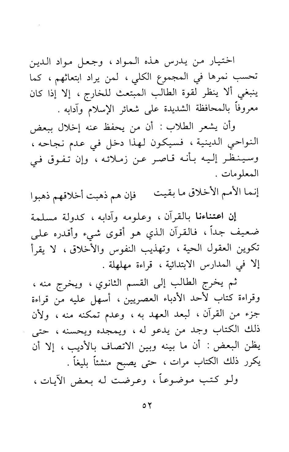 إن اعتناءنا بالقرآن، وعلومه وآدابه، كدولة مسلمة، ضعيف جدا؛ فالقرآن الذي هو أقوى شيء وأقدره على تكوين العقول الحية، وتهذيب النفوس والأخلاق، لا يقرأ إلا في المدارس الابتدائية، قراءة مهلهلة.